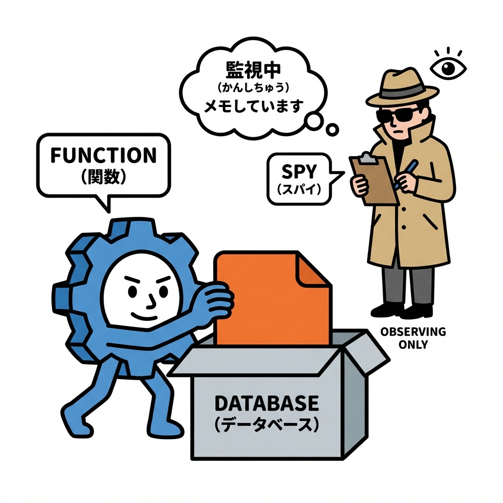 「結果(return値)だけじゃなくて、**“何が何回・どんな引数で呼ばれたか”**も確認したい…!」 そんな時に使うのが Spy(スパイ) だよ〜🕵️♀️💕
