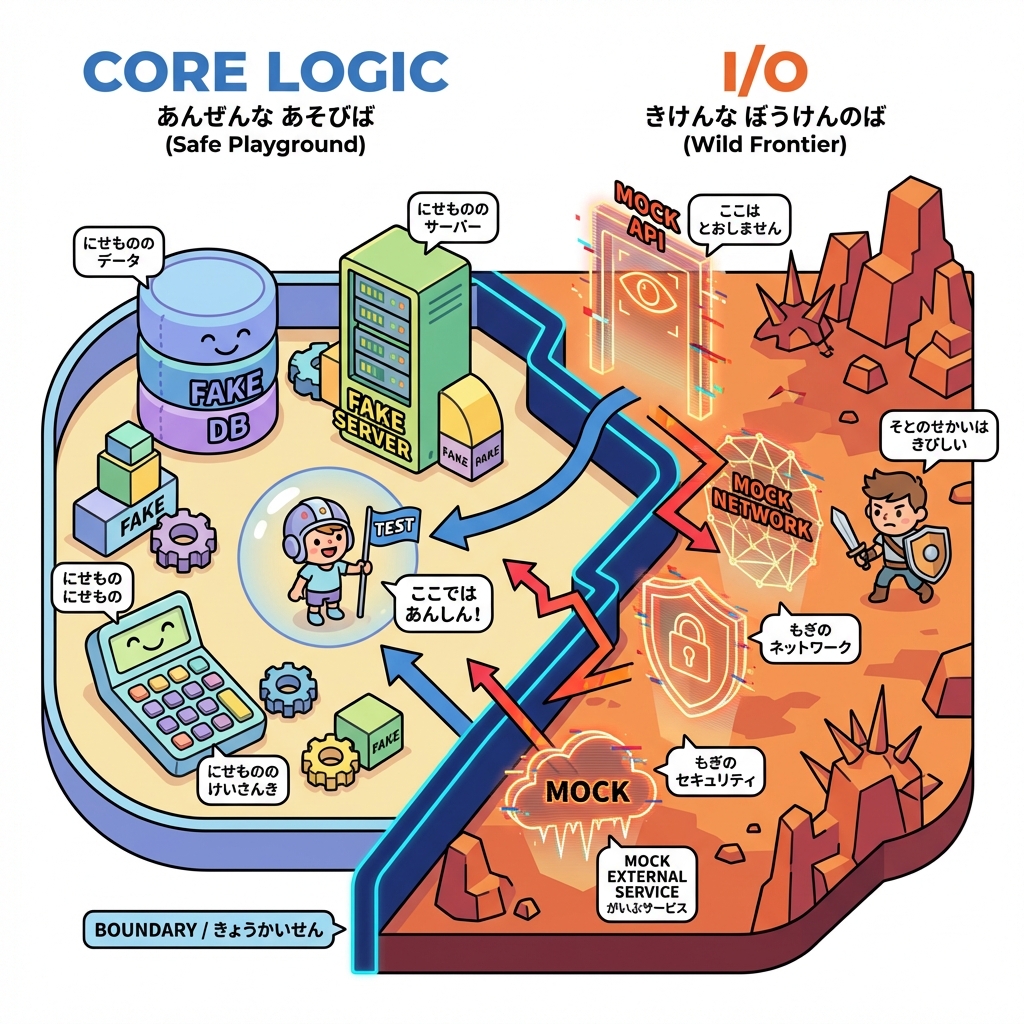 | 🌐 外部I/O | HTTP/DB/FS | Mock/Stub(境界で) | 速く・安全に |