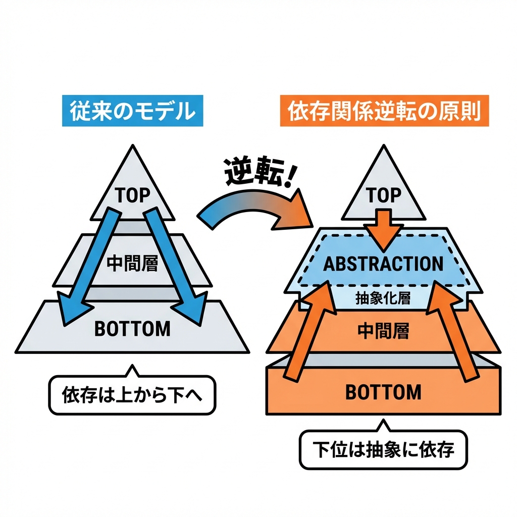 DIP(依存性逆転の原則)は、ざっくり言うと 「大事なルール(上位)を、道具の都合(下位)に振り回させない」 ための原則だよ🙅♀️🧰➡️🧠
