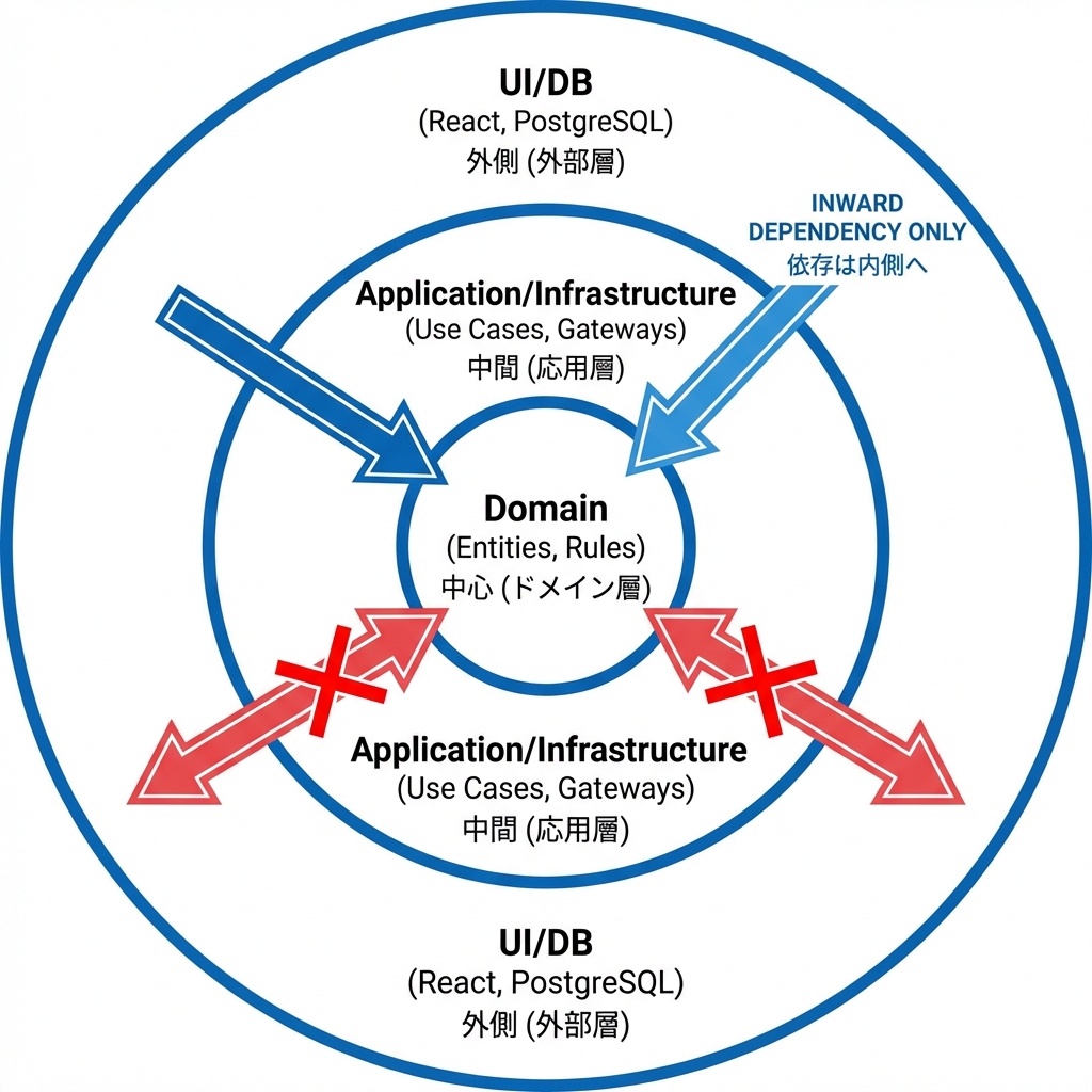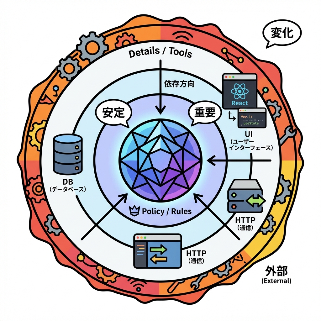 **「変わりやすい外側(UI/DB/HTTP/ライブラリ)が、変えたくない中心(業務ルール)を支配しないようにするルール」**🛡️✨