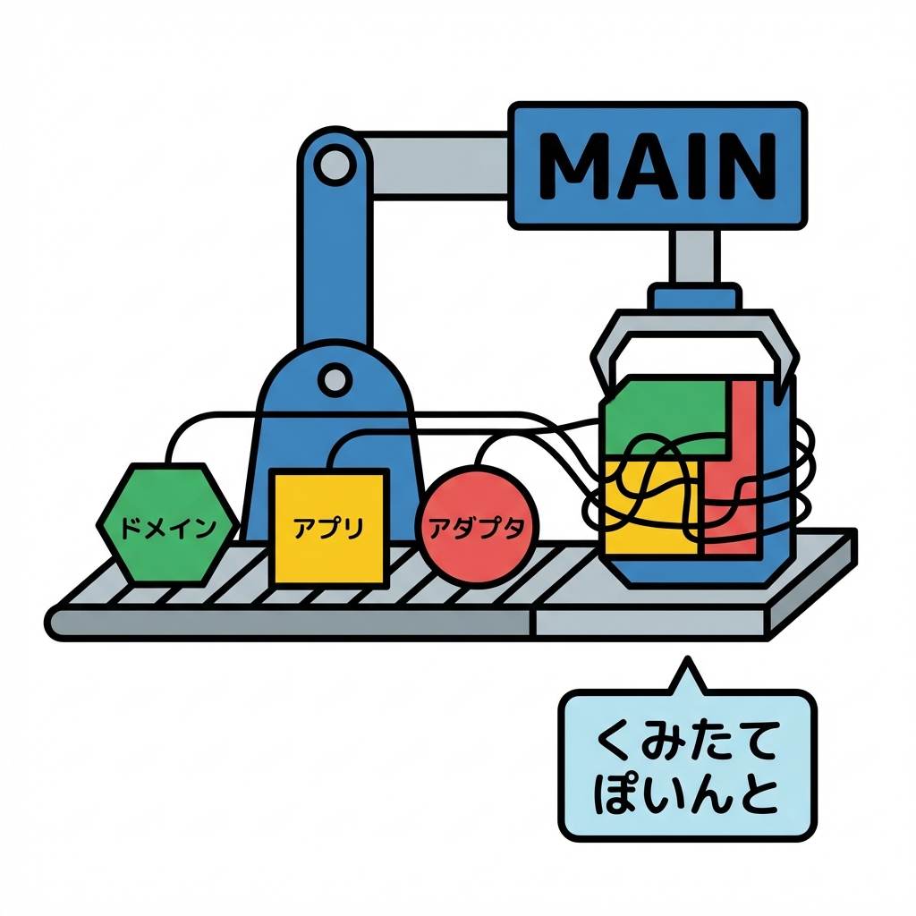 main.tsが全部を作るappは契約(repo)を受け取るadaptersは app を呼ぶ