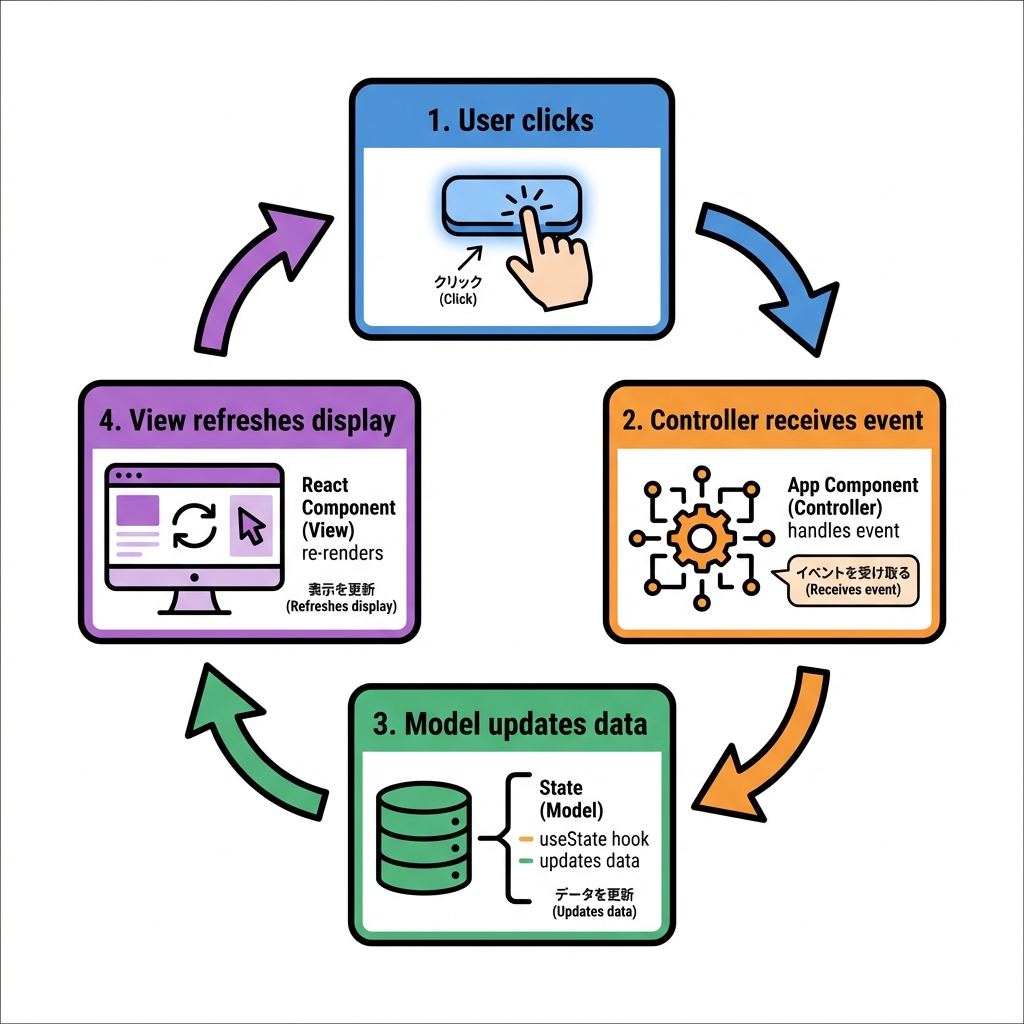 - ✅ 「ユーザー操作 → Controller → Model更新 → View再描画」 を毎回同じ形にできる