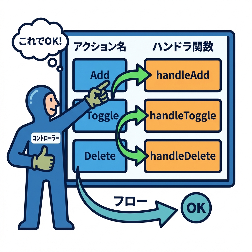操作表(Action → Handler の対応表) をControllerに置く🗺️ 「操作名を見て、対応する関数にジャンプする」だけにする💨